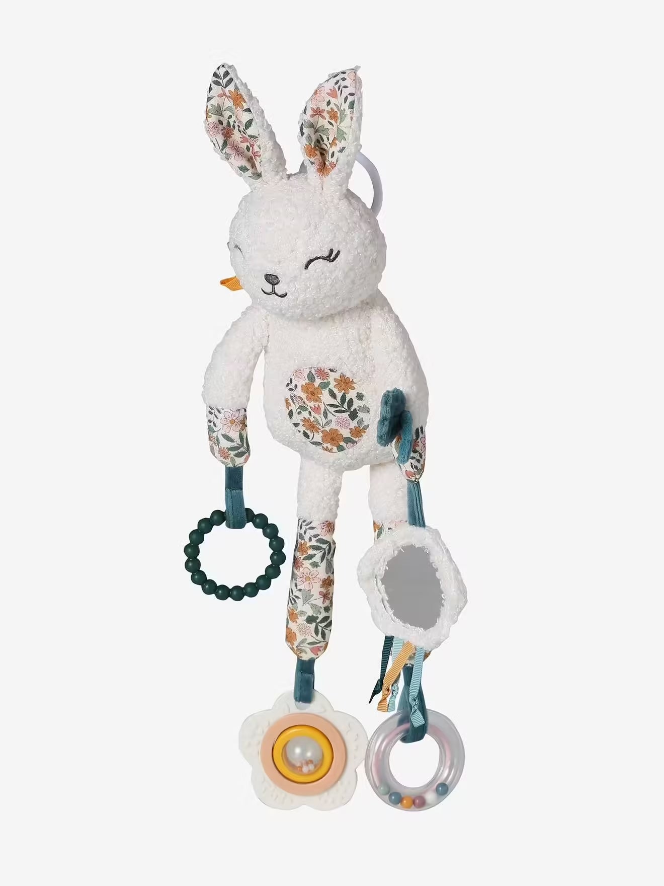 Designed in soft sherpa fabric, the toy includes multiple suspended accessories to keep little hands busy: